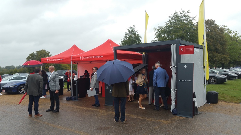 Eingangs schon parkten einige sehenswerte Fahrzeuge doch ziemlich gefährlich für den Unterboden am Strassenrand... Ferrari empfing mit einem Stand vor Eintritt die Ferraristi mit Gebühr...Kurz noch die App zur Nachverfolgung für den Corona Virus runtergeladen, installiert, registriert und schon konnten wir mit unseren blauen wrist-Bändchen eintreten...